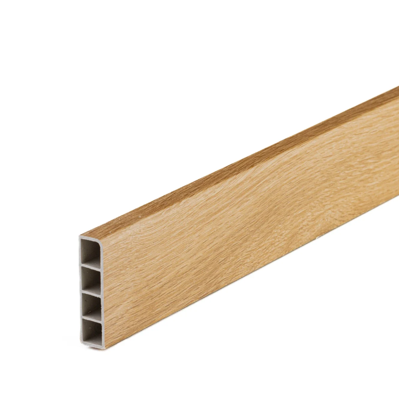Listwa wykończeniowa w odcieniu złotego dębu (ciepły). Komorowa konstrukcja – lekka i sztywna. Powierzchnia z fakturą drewna, odporna na wilgoć i łatwa w czyszczeniu.