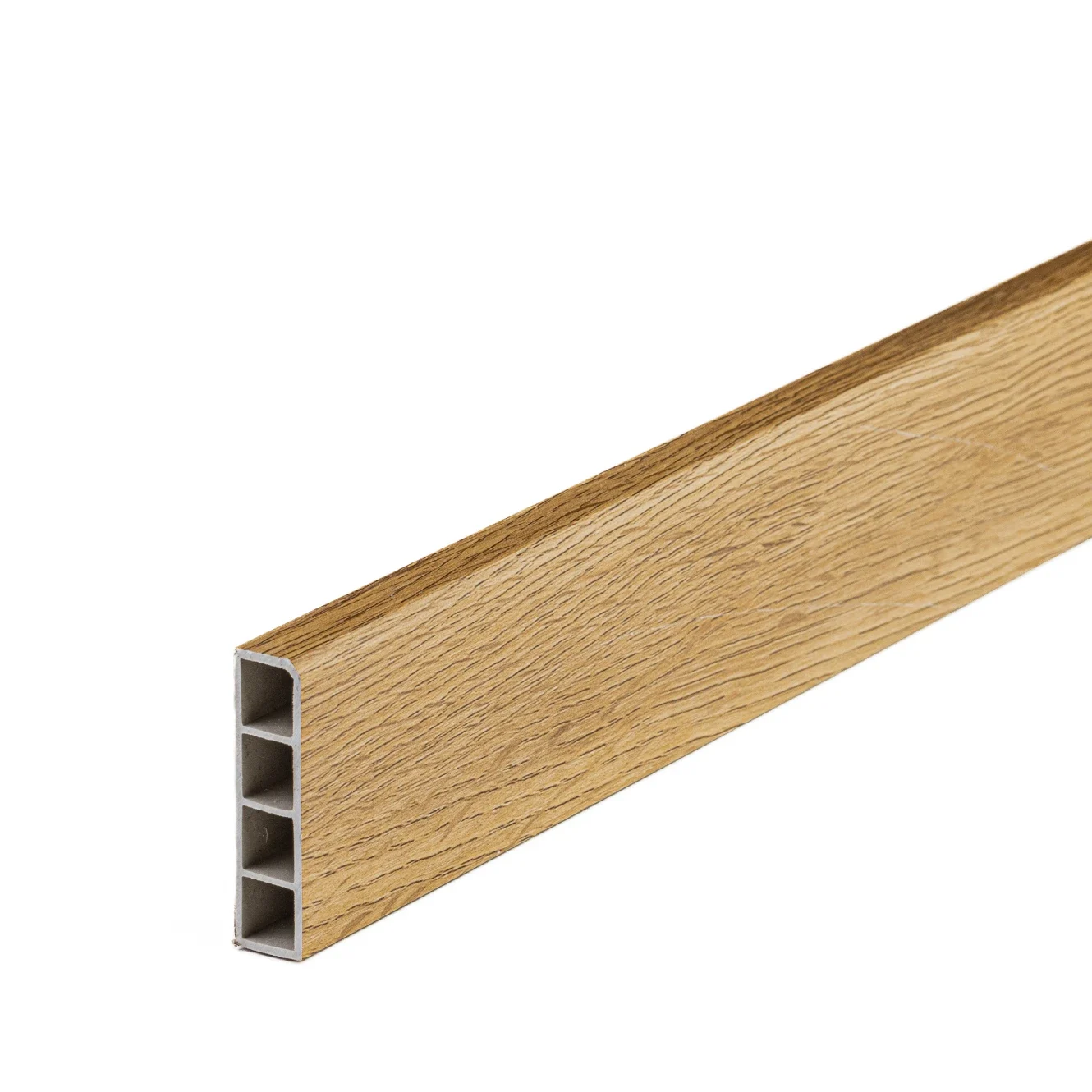 Listwa wykończeniowa w dekorze dębu naturalnego (ciepły, średni odcień). Komorowa konstrukcja — lekka i sztywna; powierzchnia odporna na wilgoć i łatwa w czyszczeniu.