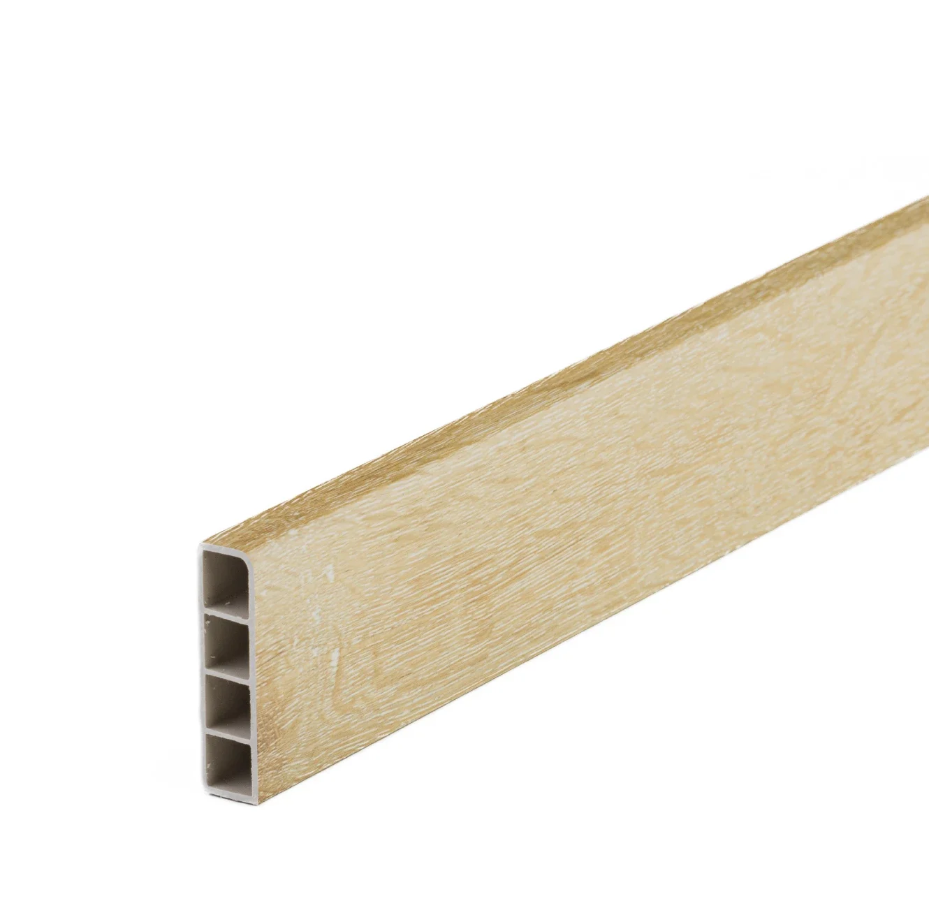 Listwa wykończeniowa w dekorze jasnego, piaskowego dębu. Komorowa konstrukcja (lekka i sztywna), powierzchnia z delikatną fakturą drewna – odporna na wilgoć i łatwa w czyszczeniu