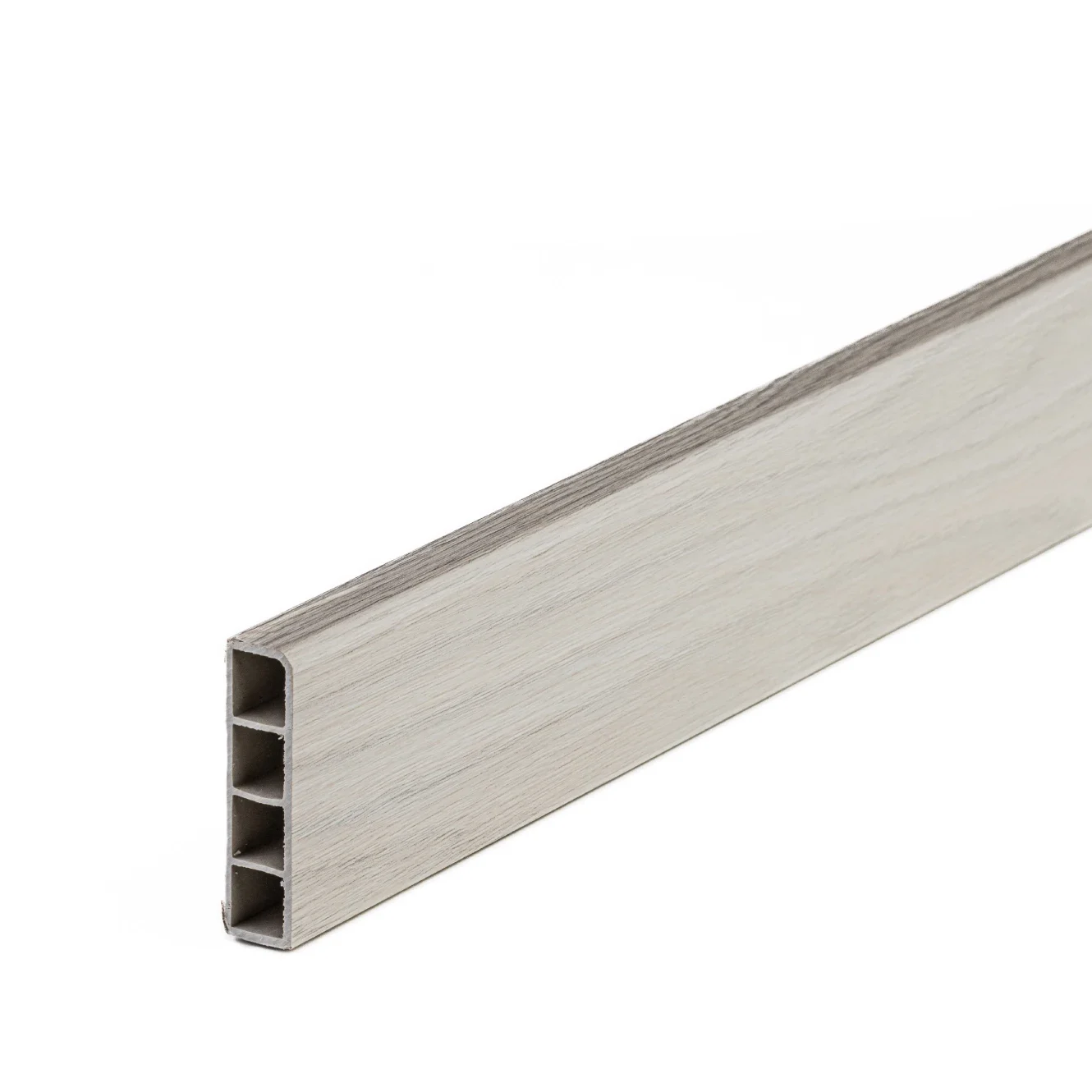 Listwa wykończeniowa w odcieniu bielonego dębu (jasny szarobeż). Komorowa konstrukcja — lekka i sztywna. Powierzchnia z delikatną strukturą drewna, odporna na wilgoć i prosta w czyszczeniu.