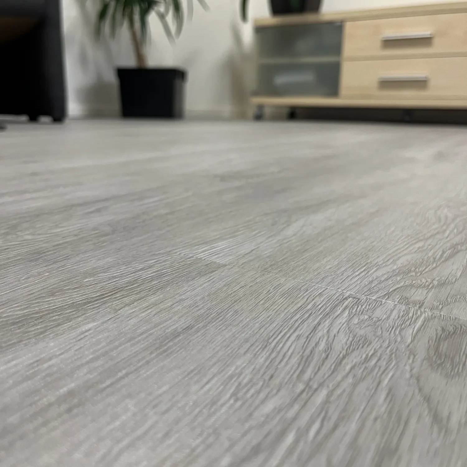Bardzo elegancka podłoga! Szary odcień z lekkim drewnianym rysunkiem wygląda świetnie, zwłaszcza w nowoczesnym wnętrzu. Daje taki spokojny, uporządkowany klimat — super pasuje do białych mebli i betonu. Po ułożeniu wszystko wygląda równo, a sam montaż poszedł gładko. Matowa powierzchnia nie błyszczy się i fajnie maskuje kurz. Zdecydowanie produkt klasy premium, mimo że cena nadal rozsądna.
